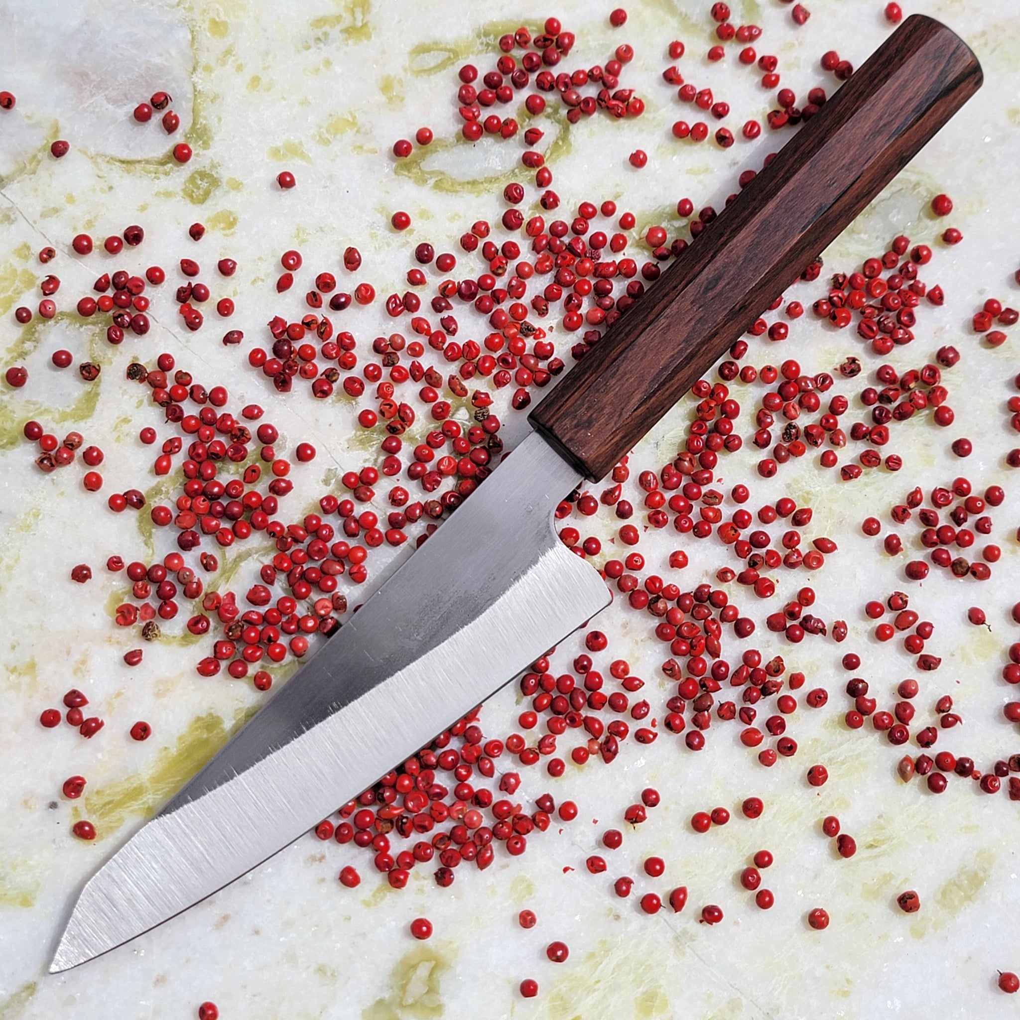 Small preparation knife with a 17 cm blade that is made from 420 MoV stainless steel. The octagonially shaped handle is made from soto wood.