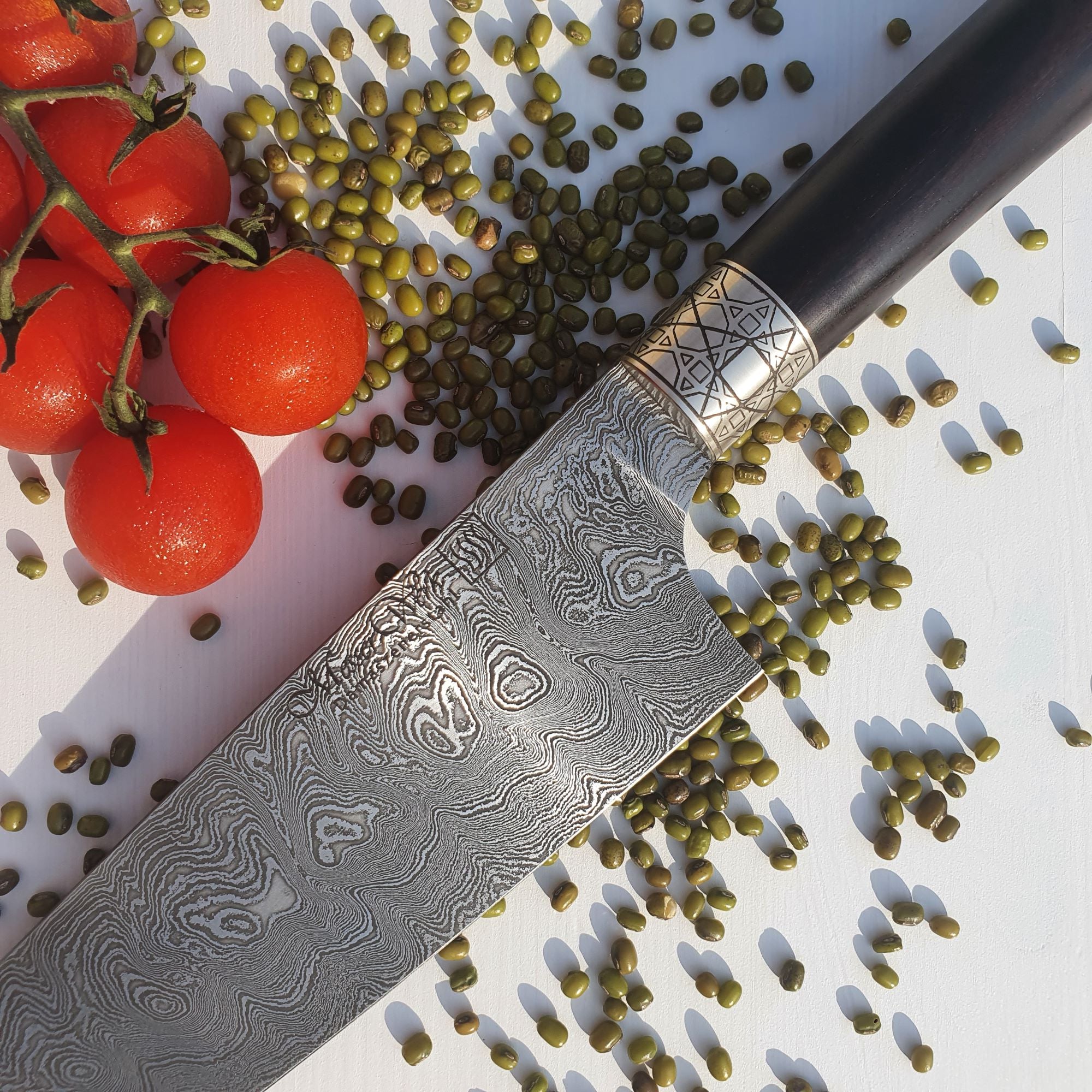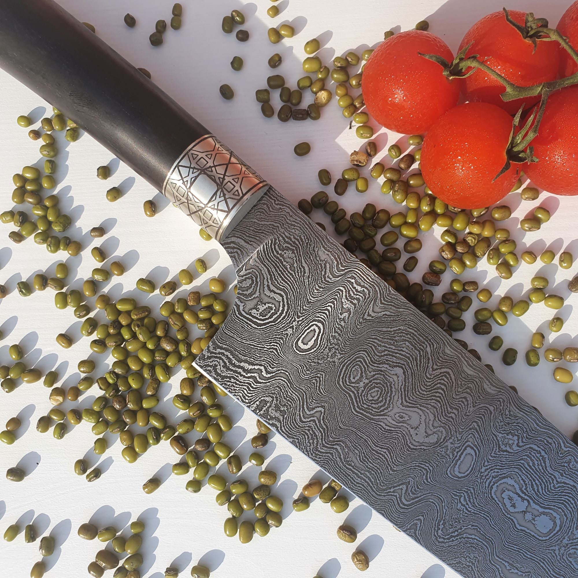Santoku with a 360 layer, 19 cm Damascus blade. This knife's handle uses top of the line Makassar ebony as handle material. The ebony used stems from cut-offs of the original material used for the flooring of some of the rooms of the Louvre Abu Dhabi. The knives feature solid silver bolsters, which have been etched with an Arabic geometric pattern resembling the pattern used for the iconic roof of the Louvre Abu Dhabi building.